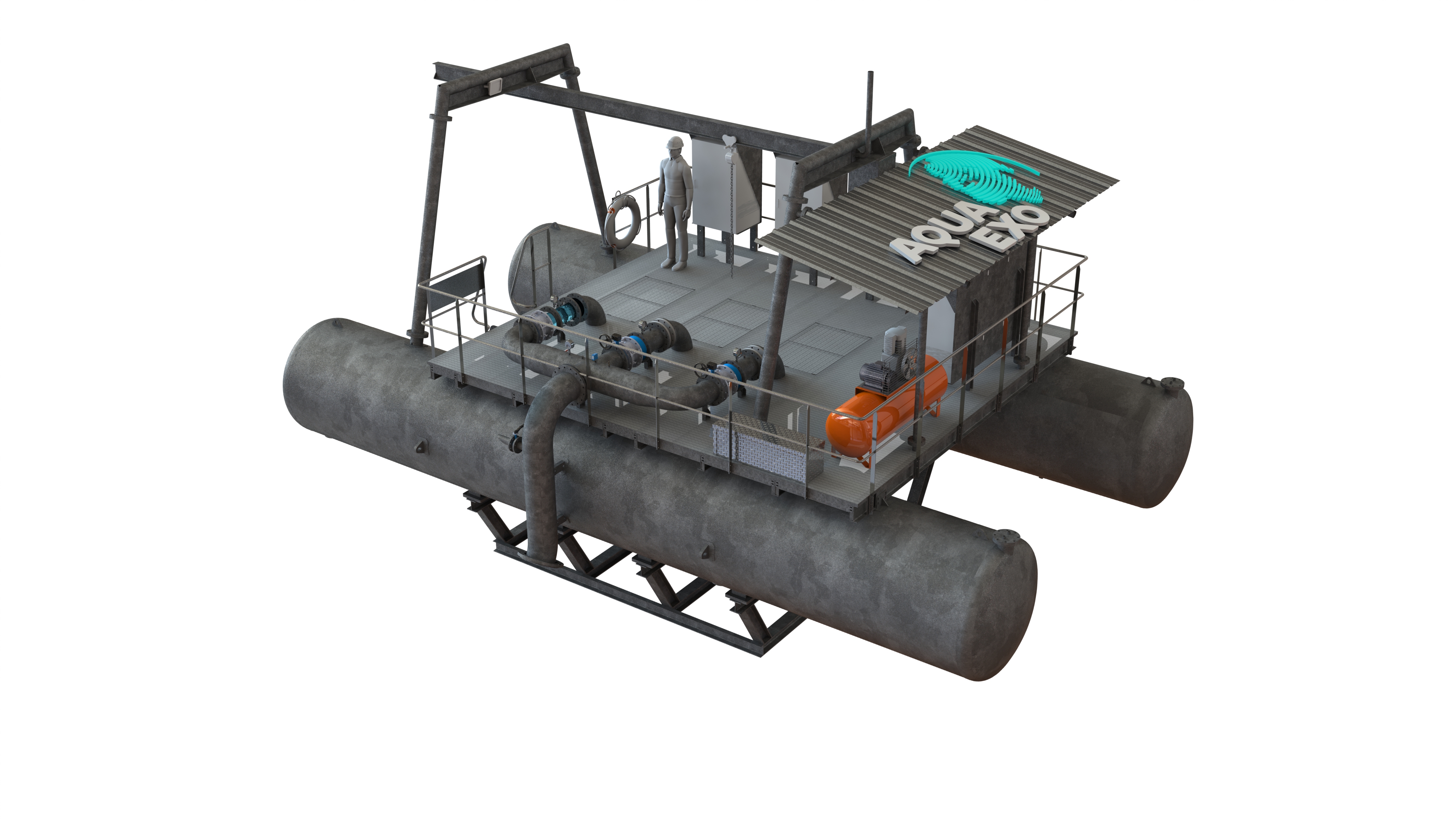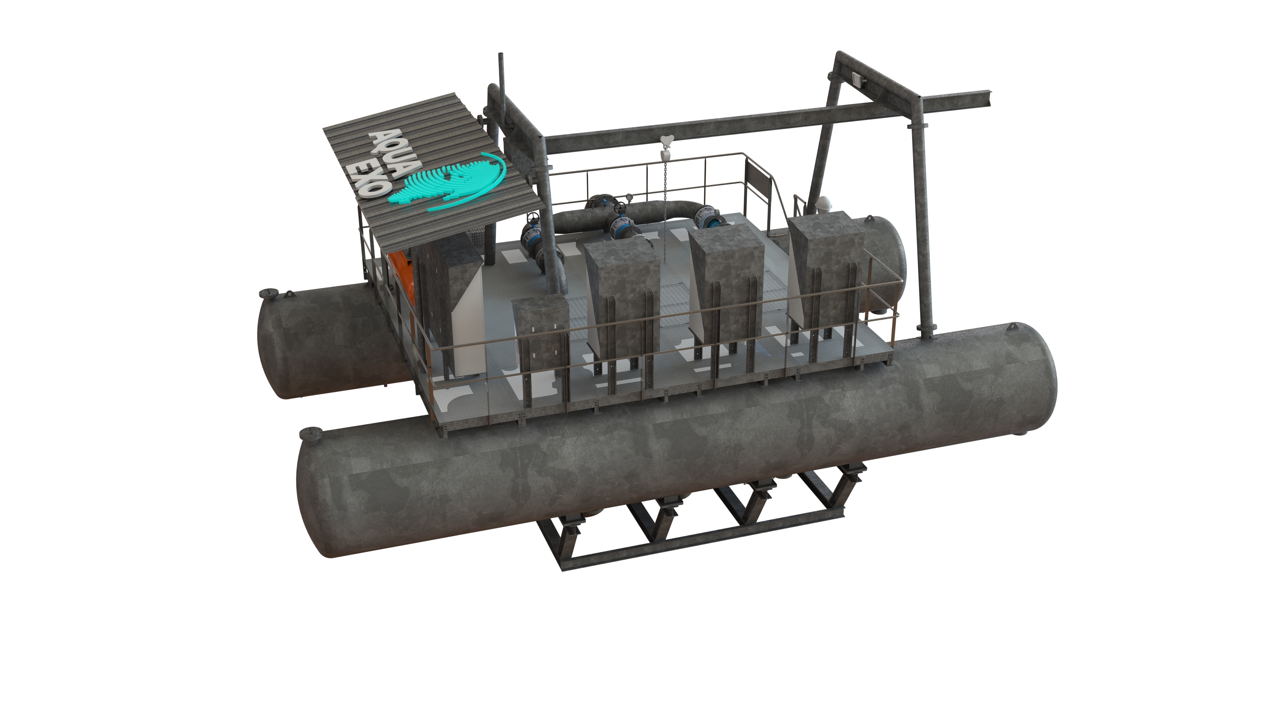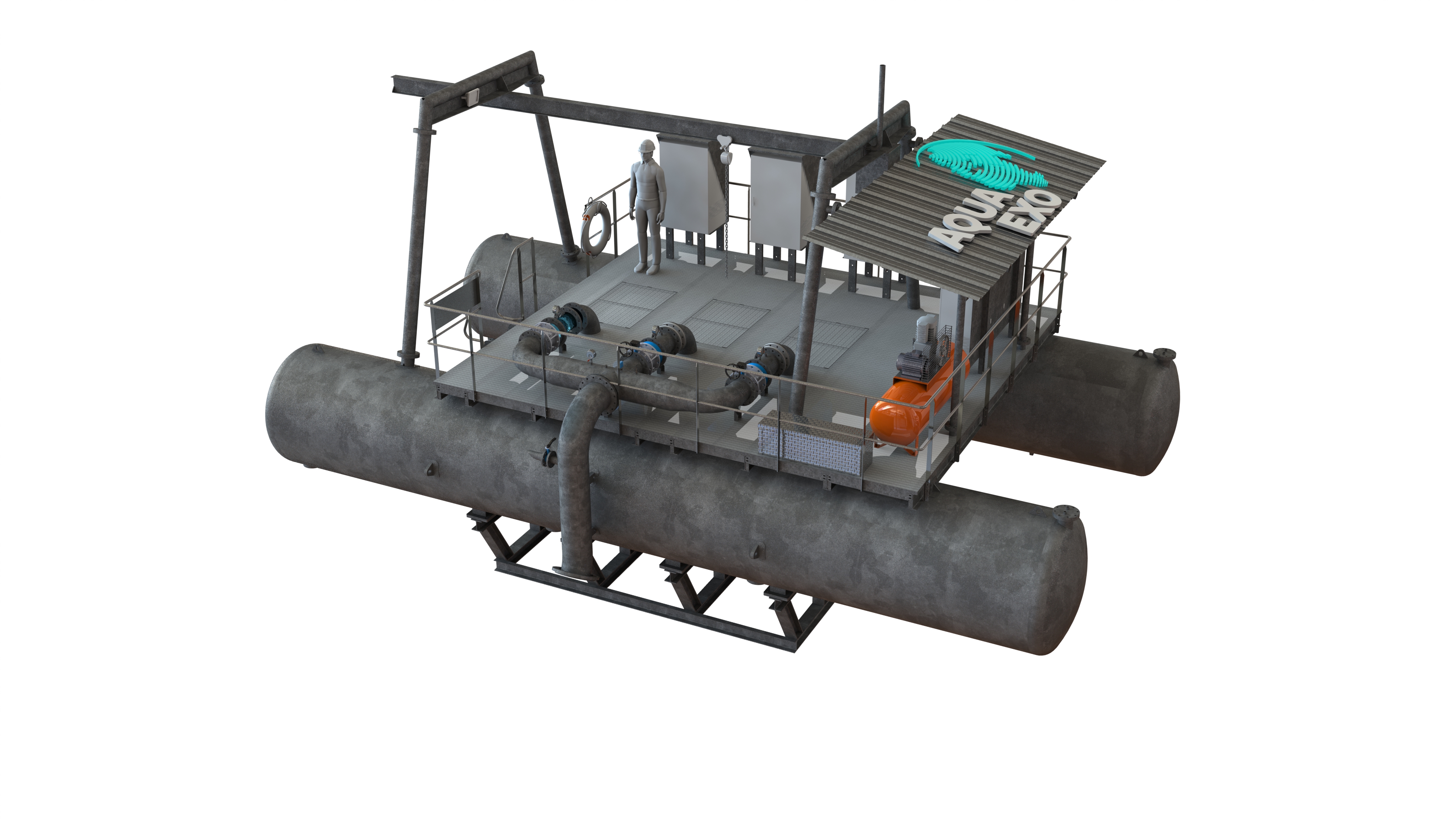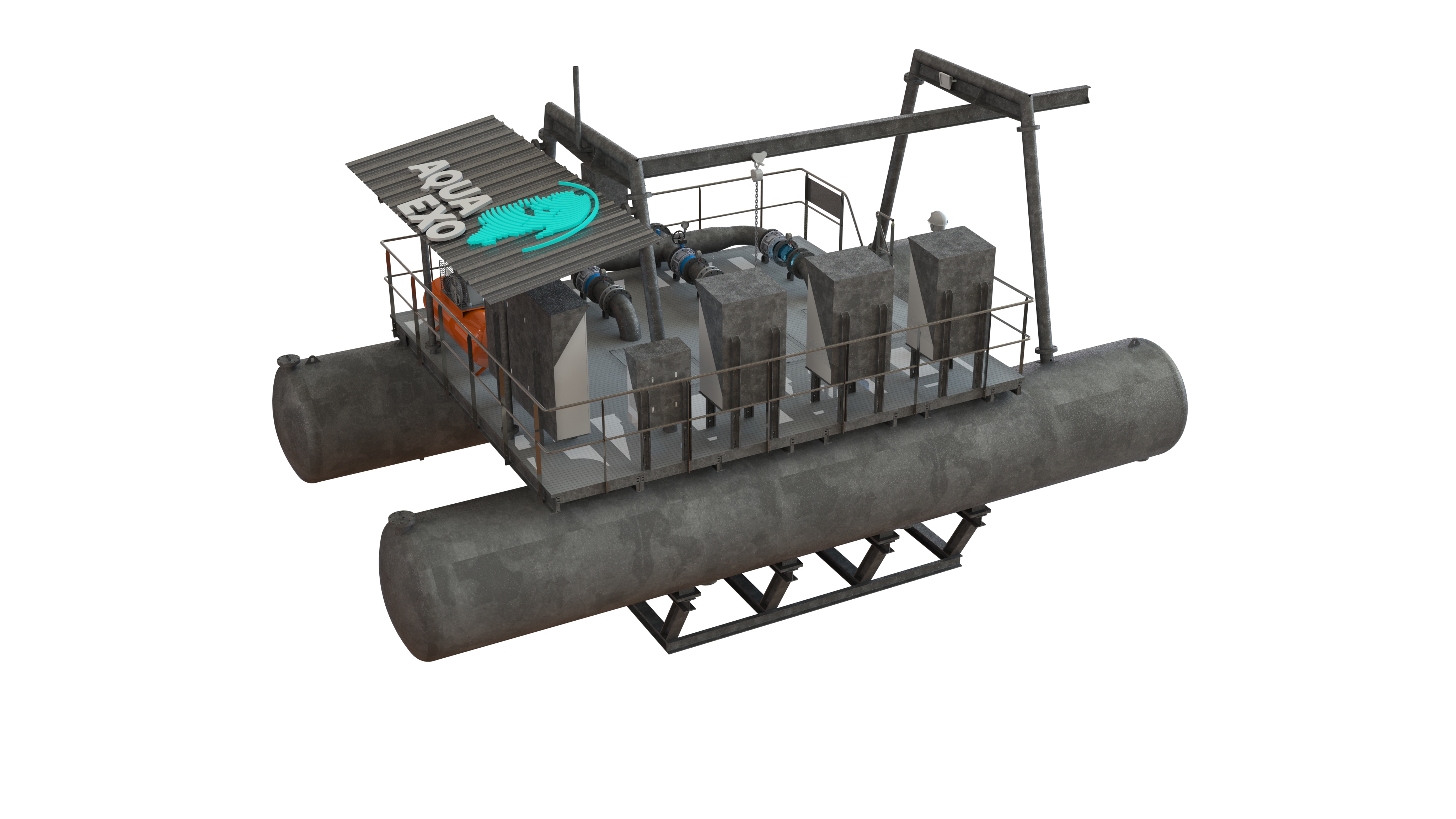 > La structure flottante supporte l'ensemble de la plateforme technique, incluant les conduites, la robinetterie, les équipements hydrauliques et l'armoire électrique.