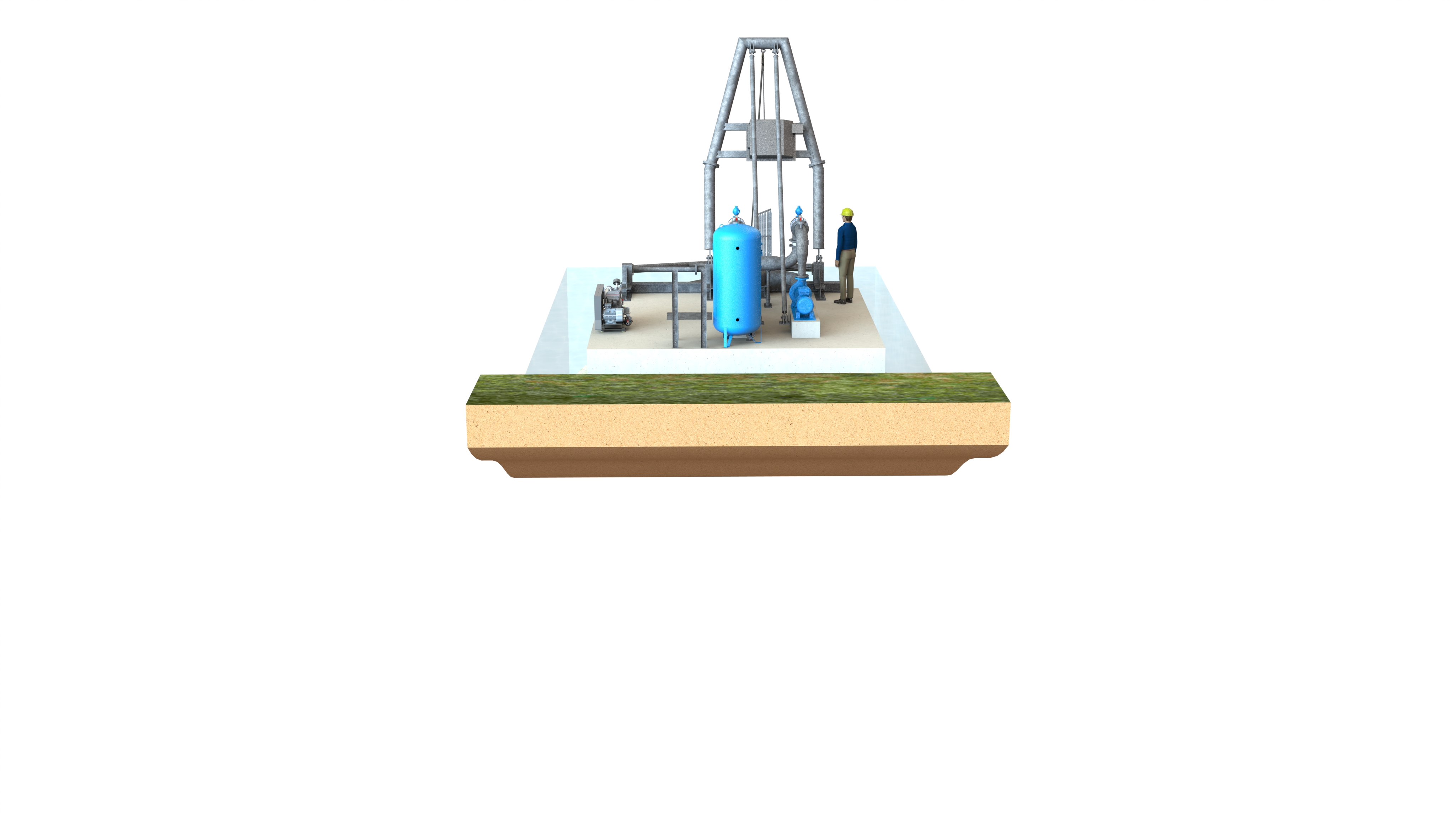 > La pompe de surface, installée sur le skid, est maintenue en charge grâce à un clapet de pied et un système d'amorçage intégré.