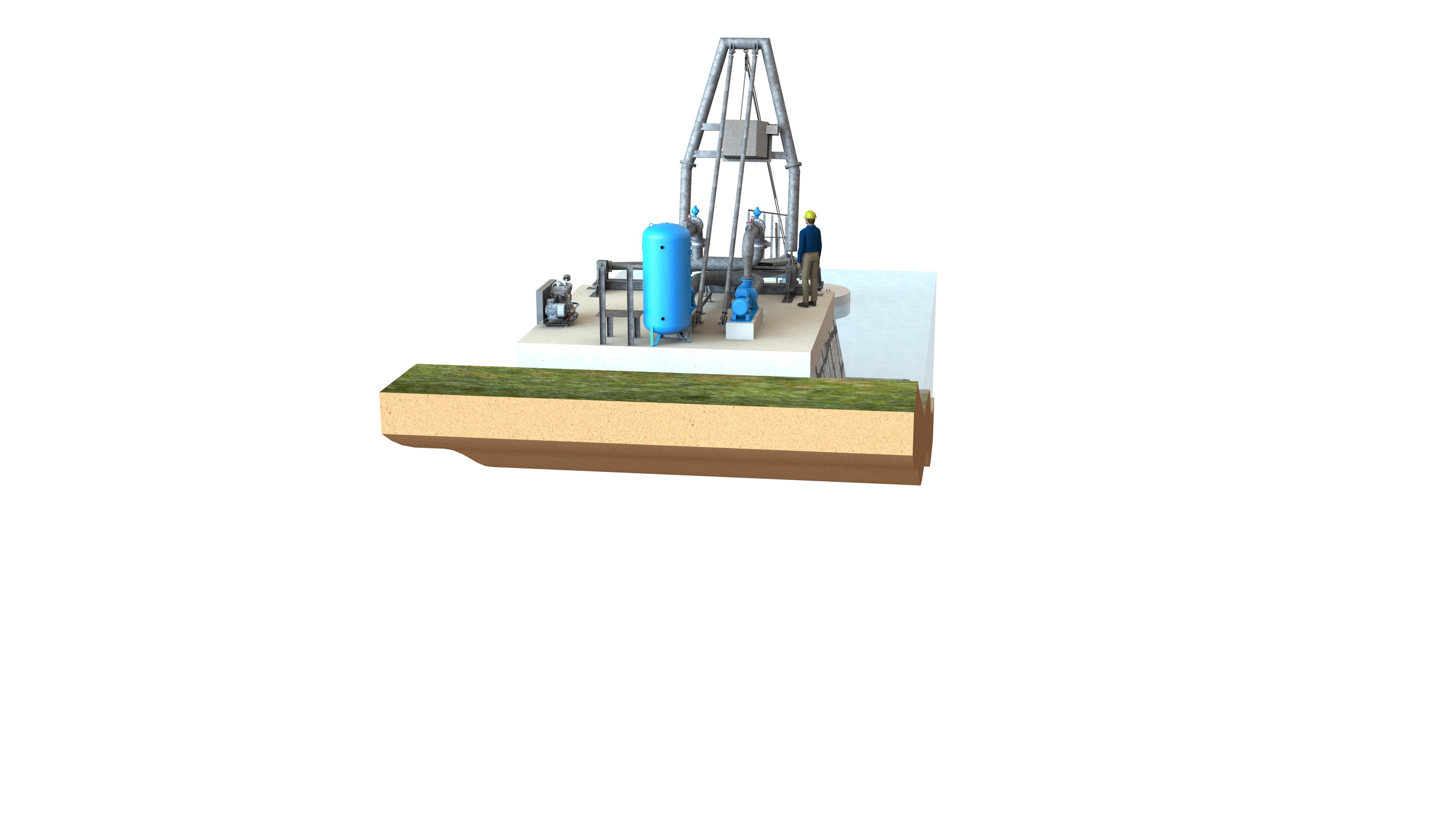 > La pompe de surface, installée sur le skid, est maintenue en charge grâce à un clapet de pied et un système d'amorçage intégré.